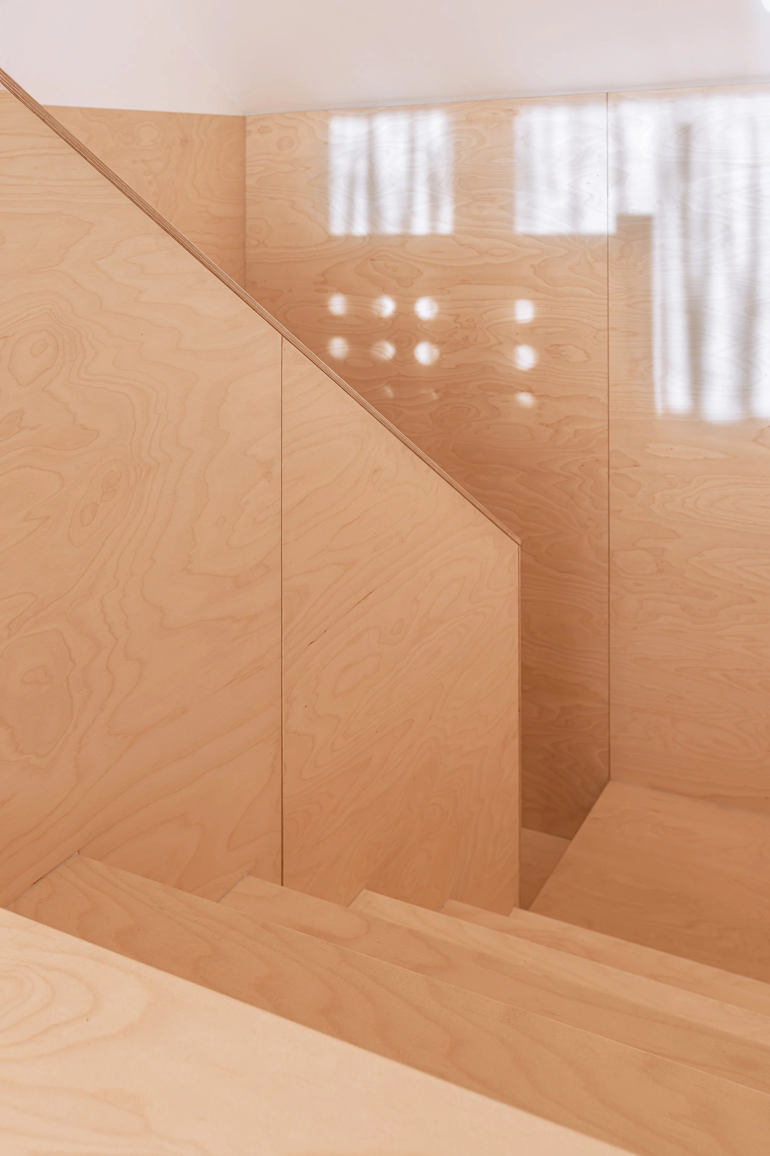 Dispozice se částečně vrací k původnímu uspořádání. Vstupní dveře přesouváme zpět na historickou pozici a vzniká tak vstupní hala s novým schodištěm. To je navrženo především s ohledem na pohodlí a bezpečnost stárnoucích rodičů. Zároveň funguje jako spojovací prvek mezi starou a novou částí domu i mezi oběma podlažími. Díky celoplošnému opláštění březovou překližkou působí jako vložený, soudobý element v historickém prostoru.