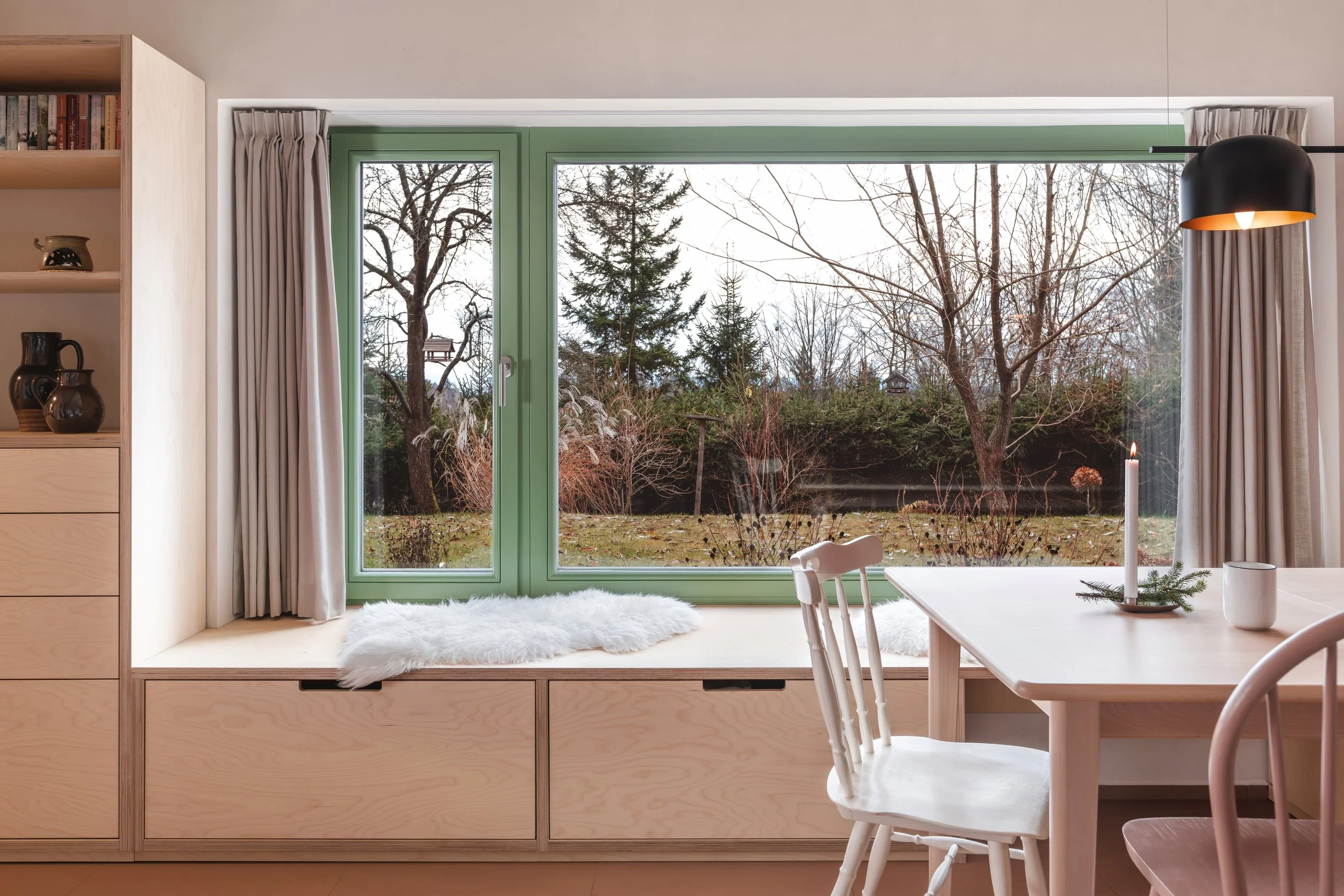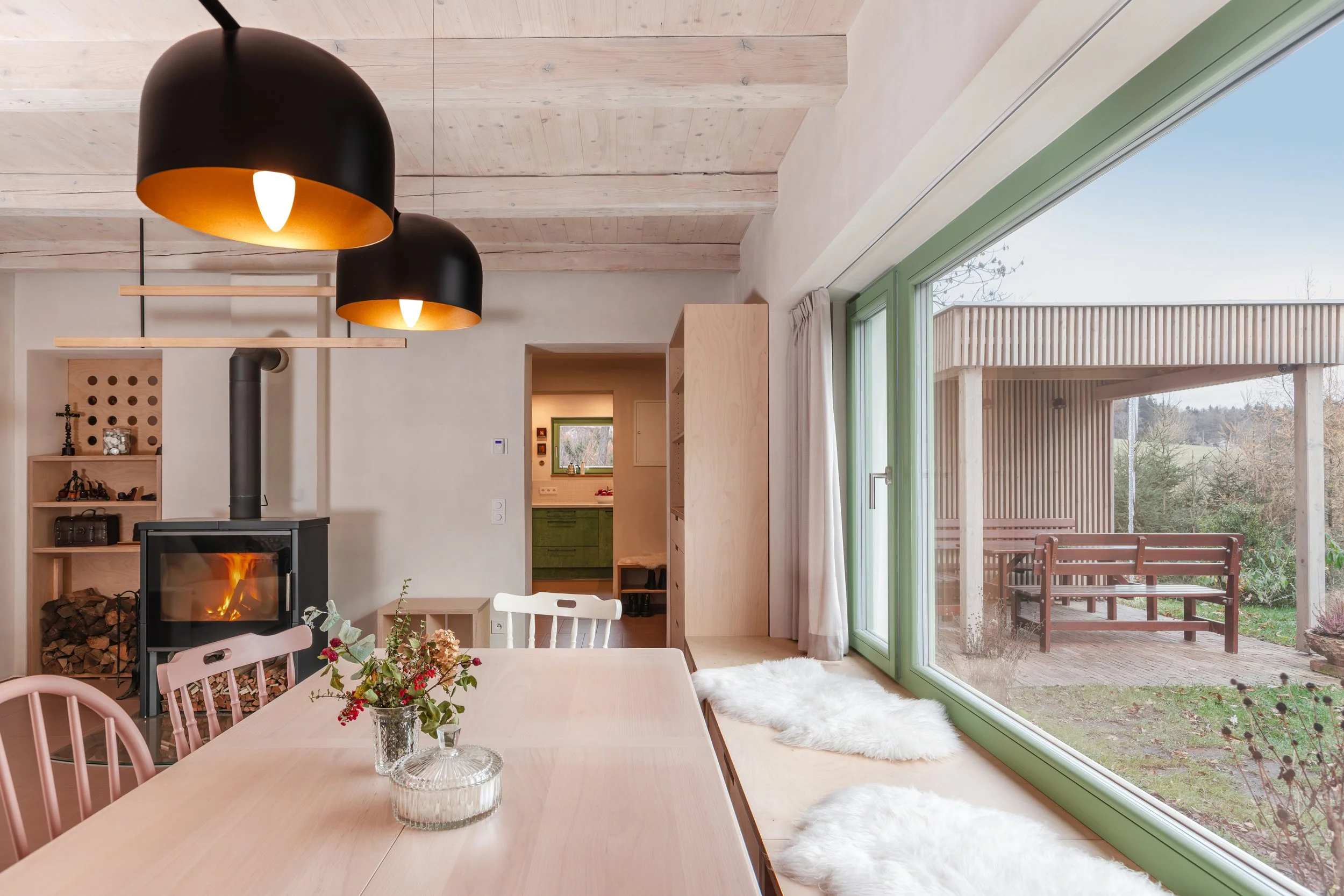 V přízemí vzniká nová světnice. Dva původní okenní otvory jsme spojili do jednoho velkého okna orientovaného do zahrady, čímž se prostor výrazně prosvětlil. Odstraněním dřevěného obložení, které místnost opticky zmenšovalo, a odkrytím původního trámového stropu získal interiér lehkost a autentičtější charakter. Středem světnice jsou kamna jako hlavní zdroj vytápění, doplněná podlahovým topením v celém přízemí.