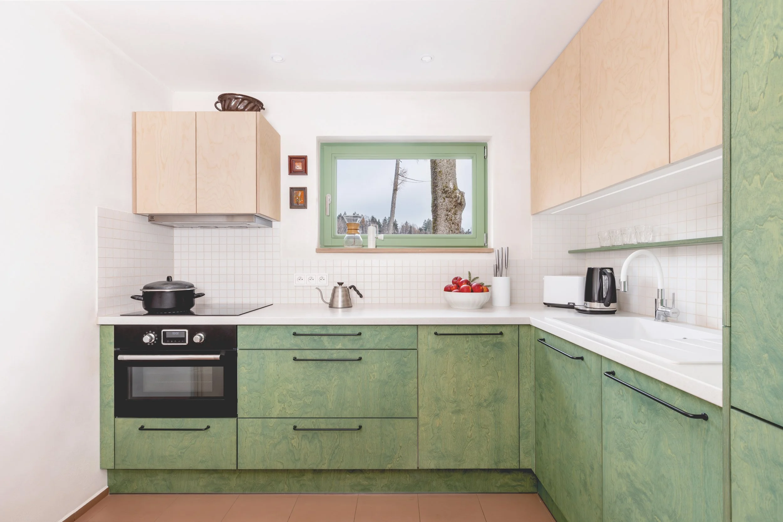 V nové části domu se nachází plnohodnotná kuchyně s výhledem do zeleně a koupelna s prostorným walk-in sprchovým koutem. Z koupelny je přístupný i úložný prostor pod schodištěm, kde je umístěna pračka a bojler.