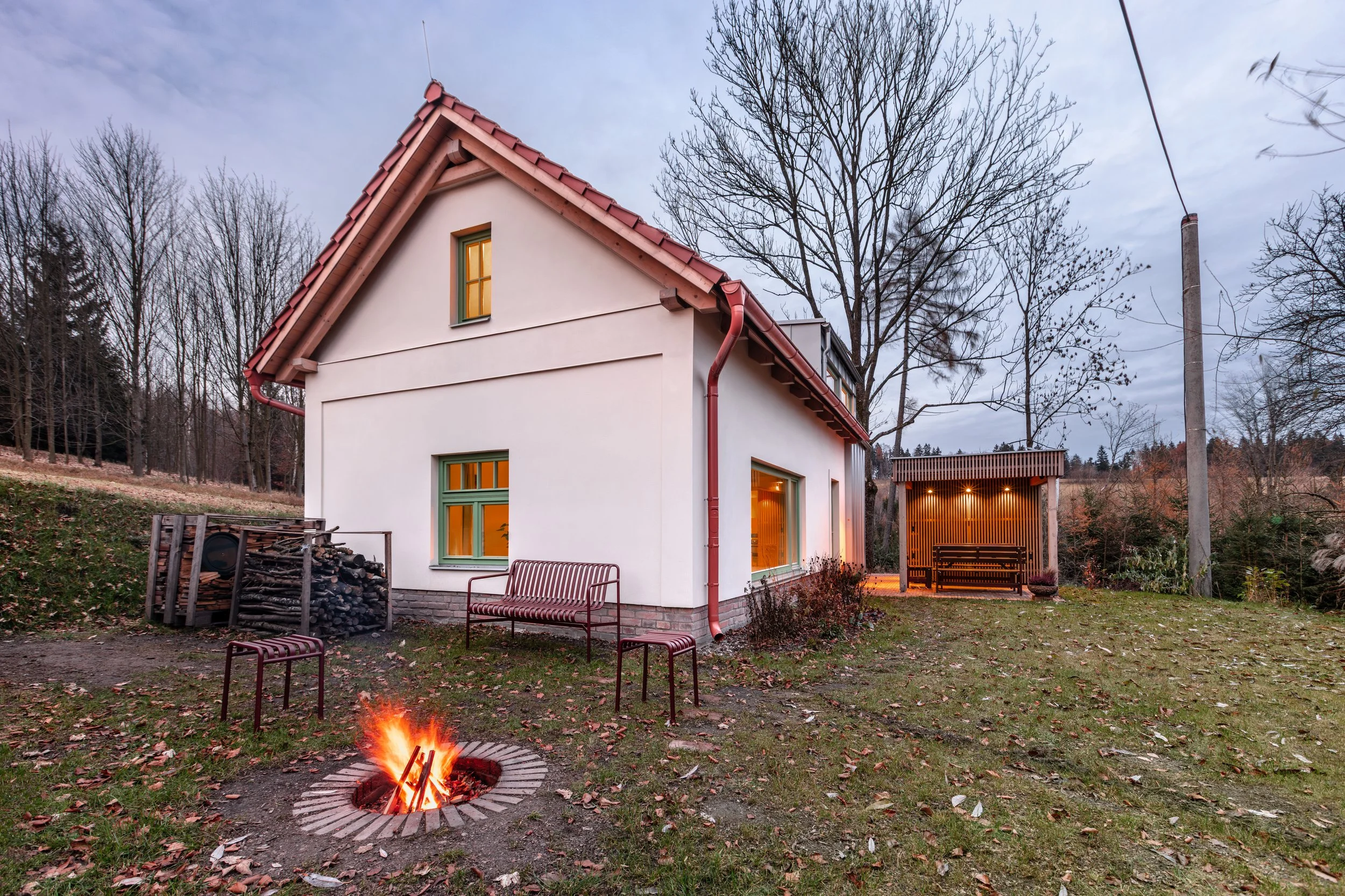 V kontrastu k tomu stojí nová přístavba – plně oplechovaná, spolu s novou kubickou kůlnou a pergolou. Celkový objem domu zůstává zachován, avšak výsledná forma není pouhou replikou tradiční vesnické architektury, ale jejím současným pokračováním.